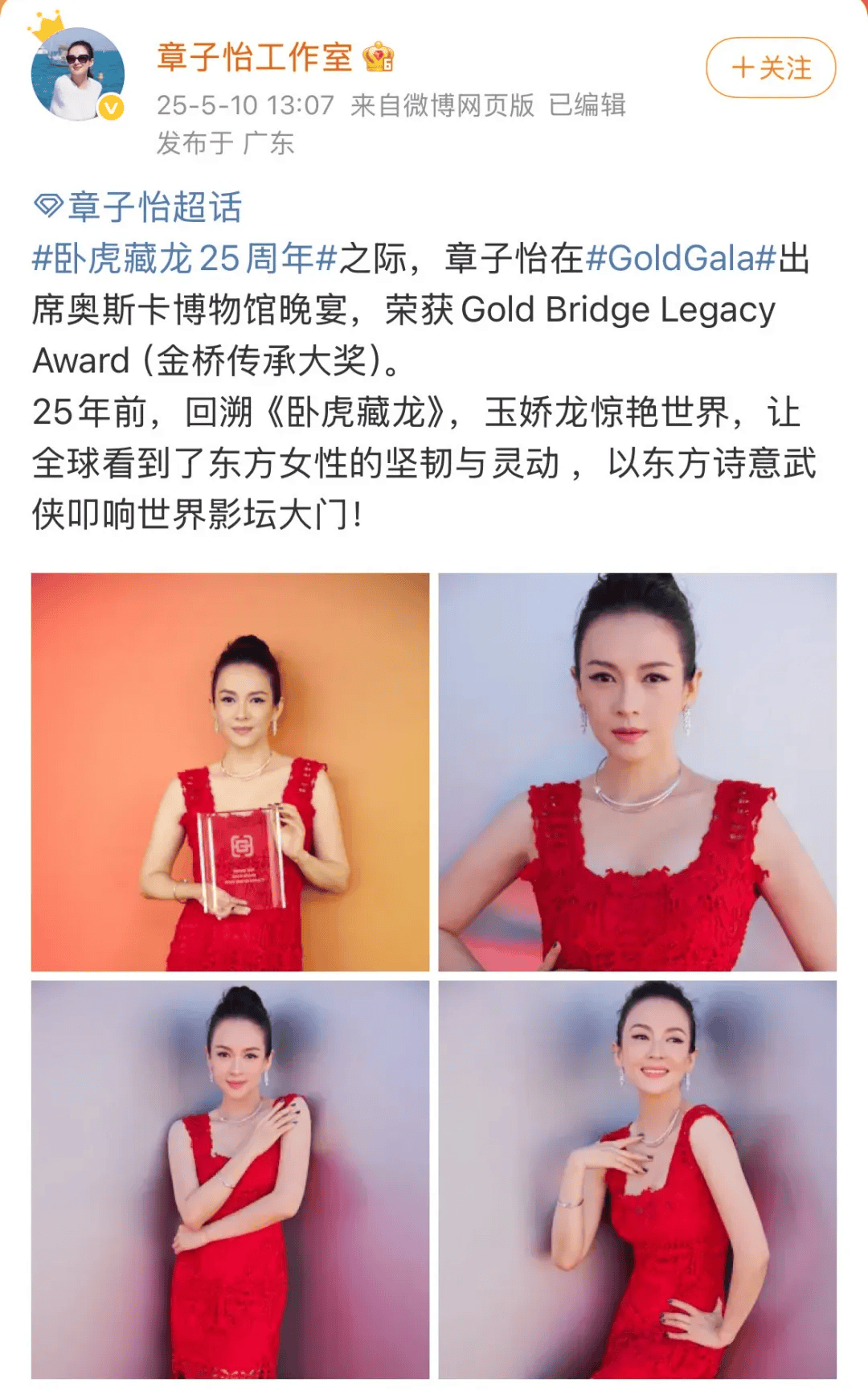 《卧虎藏龙》25周年之际,章子怡在GoldGala出席奥斯卡博物馆晚宴 ,荣获Gold Bridge Legacy Award(金桥传承大奖)皇冠信用網开户 。25年前,回溯《卧虎藏龙》,玉娇龙惊艳世界,让全球看到了东方女性的坚韧与灵动,以东方诗意武侠叩响世界影坛大门。